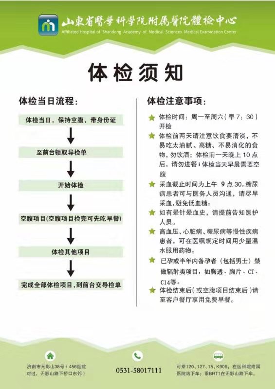 (二)體檢地點:山東省醫學科學院附屬醫院體檢中心(位置:濟南市無影山38號(456醫院對面)1號樓查體中心);
